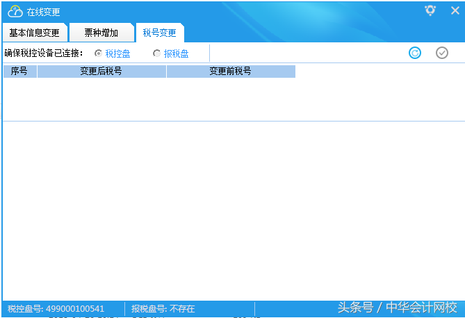 4、在线变更:点击"系统设置-税控设备设置-税控设备在线变更”,实现纳税人识别号、纳税人名称、税务机关代码(离线控制信息)变更内容在线远程写入税控设备。