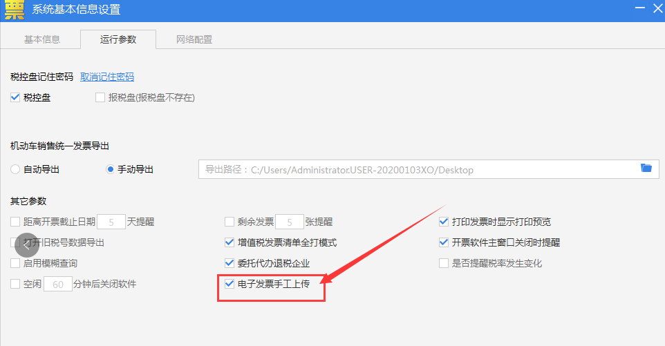 升级之后登陆开票软件在【系统设置】-【参数设置】-【运行参数】勾选电子发票手工上传,点击【确定】按钮,重启电子发票服务平台后即可正常上传电子发票。