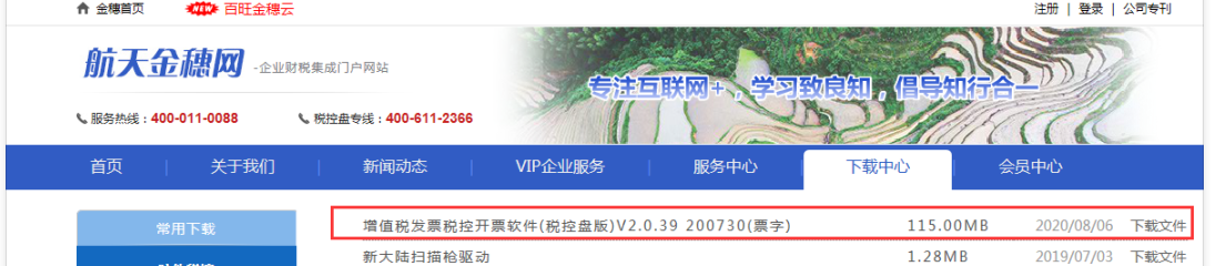 2.点击【下载中心】-【防伪税控】-增值税发票税控开票软件(税控盘版)v2.0.39200730(票字版);