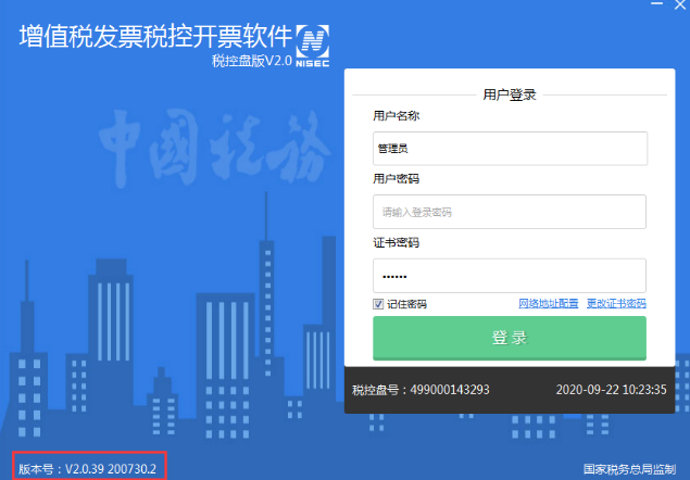 升级完成后打开开票软件,在登录页面左下角确认版本号为V2.0.39200730.2,表示升级完成。