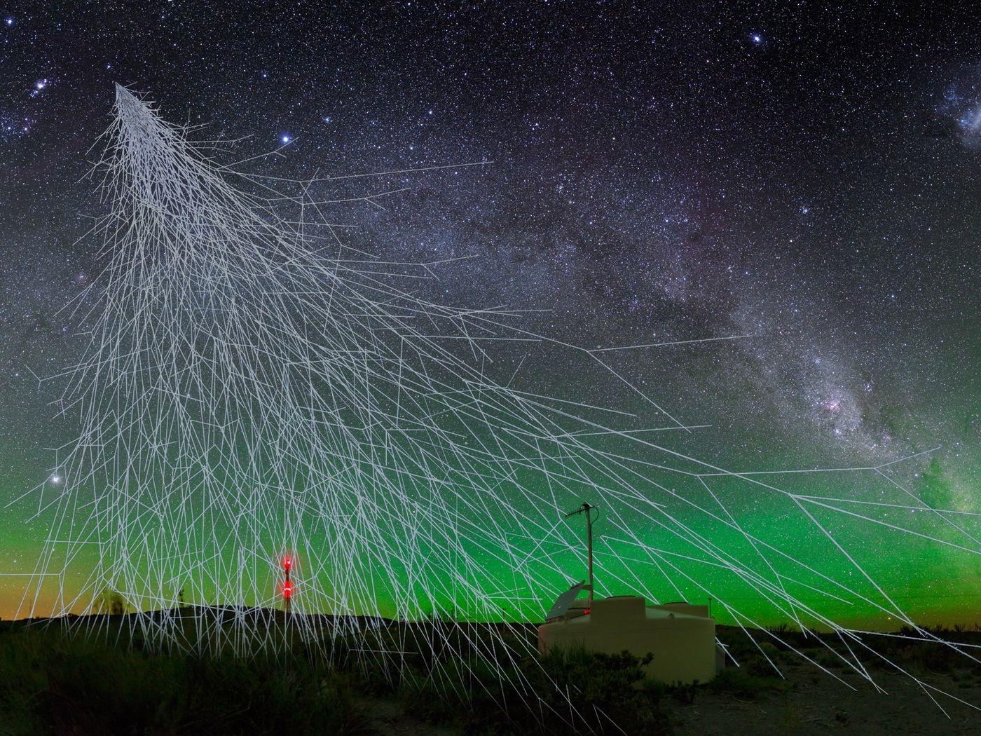 ▲艺术家笔下的宇宙线广延大气簇射(来源:The Verge)
