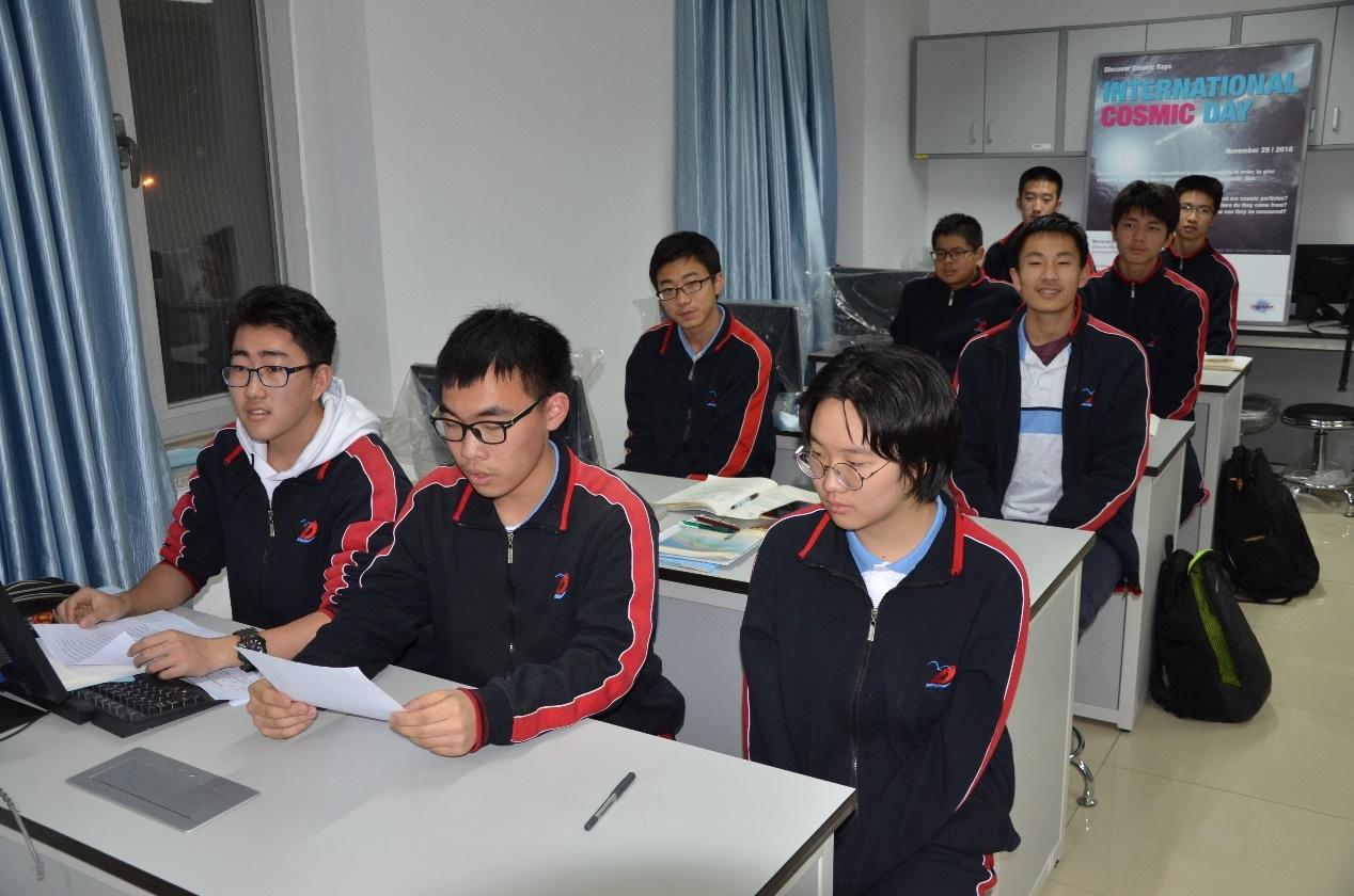 北京市东直门中学宇宙射线小组作为我国唯一参与组织,通过网络参加了国际宇宙日的视频会议,这是该小组连续第三年参加国际宇宙日活动。2016年的国际宇宙日活动中,他们提供了广延大气簇射的实验数据,在2017年又增加了μ子实验结果,他们的论文已编入会议论文集。在今年的活动中,高二学生陈石、岳思铭作为宇宙线小组的代表,在视频会议上用英文宣讲了此次小组报告。他们将实验时间增加到5天,得出了更为准确的广延大气簇射随天顶角变化关系的结果。当谈到今年参加国际宇宙日活动感受时他们说:“过程中我们既害怕出差错而紧张,又为我们是全国的唯一而骄傲自豪。”