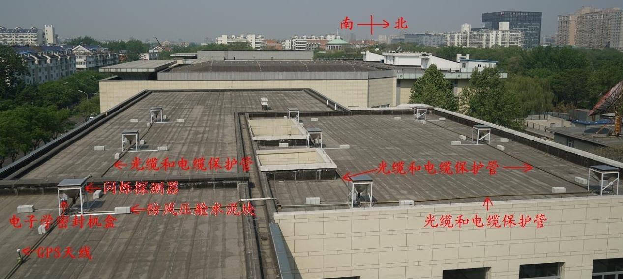 宇宙射线探测器阵列放置在学校教学楼的楼顶上,由9个闪烁探测器、前端电子学、信号数字化电路、光电转换、GPS时钟、信号光缆、计算机实时在线控制和数据采集系统等构成。该阵列与实验室计算机相连,自2016年1月开始运行,24小时不间断采集数据,至今已收集大量的宇宙射线数据。