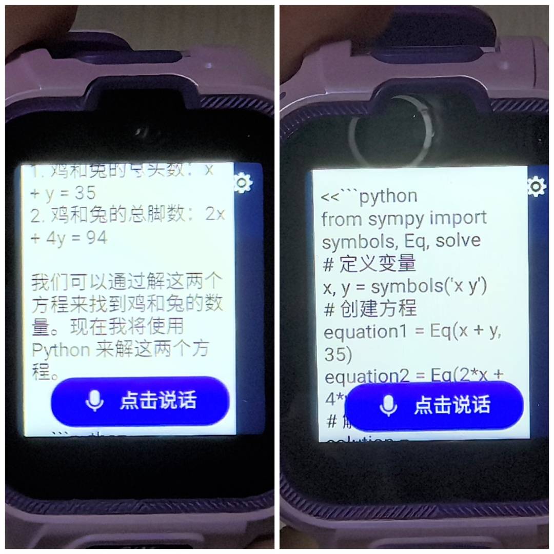 第二题,小度依然让记者“问爸妈”。小米和360均给出了完整的二元一次方程计算过程,并正确作答。360甚至还给出了python语言计算的代码并输出了结果。