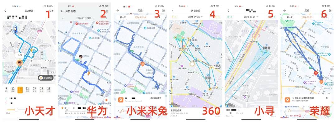 记者为接受测评的六款手机分别安装手机卡,并携带手表外出,将装有儿童手表App的手机放在家中,在外出归来后查看手表出行轨迹,模拟孩子外出、父母在家监控的场景。结果显示,各品牌均实现一定程度的定位、记录轨迹等基本功能。其中,小天才、华为、小米米兔均能实时记录孩子出行轨迹,且精确到街巷。而荣耀、小寻、360则采取监测到出行后最快3分钟定位一次再连线的方法。这导致行程轨迹在一些巷道路径出现错觉,如“横穿”住宅楼等。