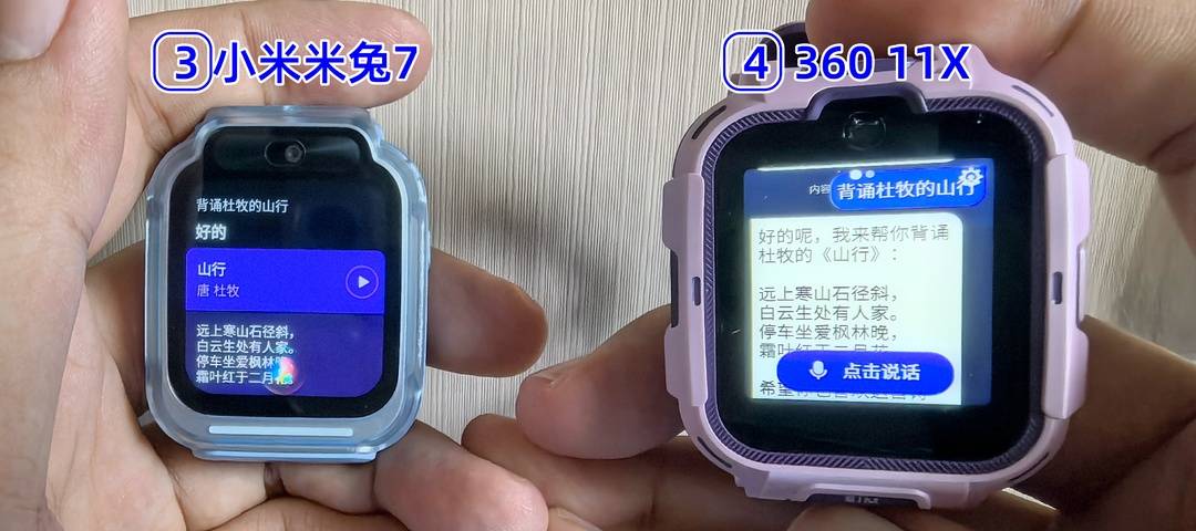 第一题,两款搭载小度的儿童手表无法正常回答,而是向记者回复“请去问问爸爸妈妈吧”。小米、360的语音助手不仅完整背出了古诗,还将其中的“斜”字读为“xié”,与目前国内通用的语文教材一致。