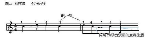 4.缩指法,即缩小手指间距弹奏的方法。一般在需要方便手指左右移动,以保持旋律上下行的顺畅时使用。如下例。