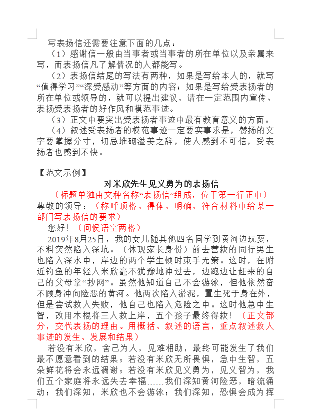 3、正文: 另起一行空两格,一要写清表扬谁。二要肯定被表扬的先进事迹。三要表达感谢之情,希望受表扬的人或集体发扬成绩,继续进步。四要宣传先进思想和事迹,号召大家学习以便形成良好的风气,提高全民的素质。