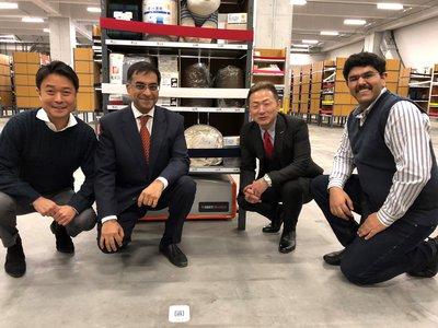 GROUND Inc. 首席执行官 Hiratomo Miyata、 GreyOrange 亚太区首席执行官 Nalin Advani、Home Logistics 首席执行官 Manabu Matsuura 和 GreyOrange 集团首席执行官 Samay Kohli 在 Nitori Holdings Group 的最新仓库中的合影