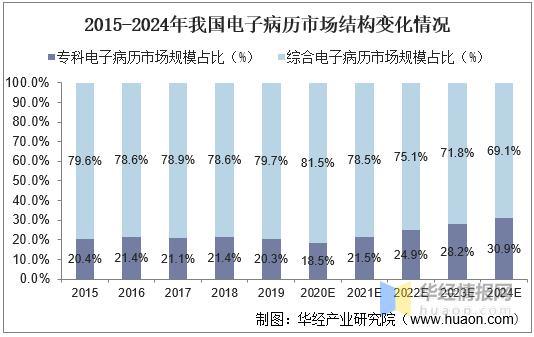 中国以往的电子病历市场增长以综合电子病历为主,医院大多不区分各个专科的电子病历,而未来随着专科需求的个性化和差异化越来越明显,专科电子病历市场的结构占比将有所提升,预计2024年我国专科电子病历市场规模占比将达到30.9%。