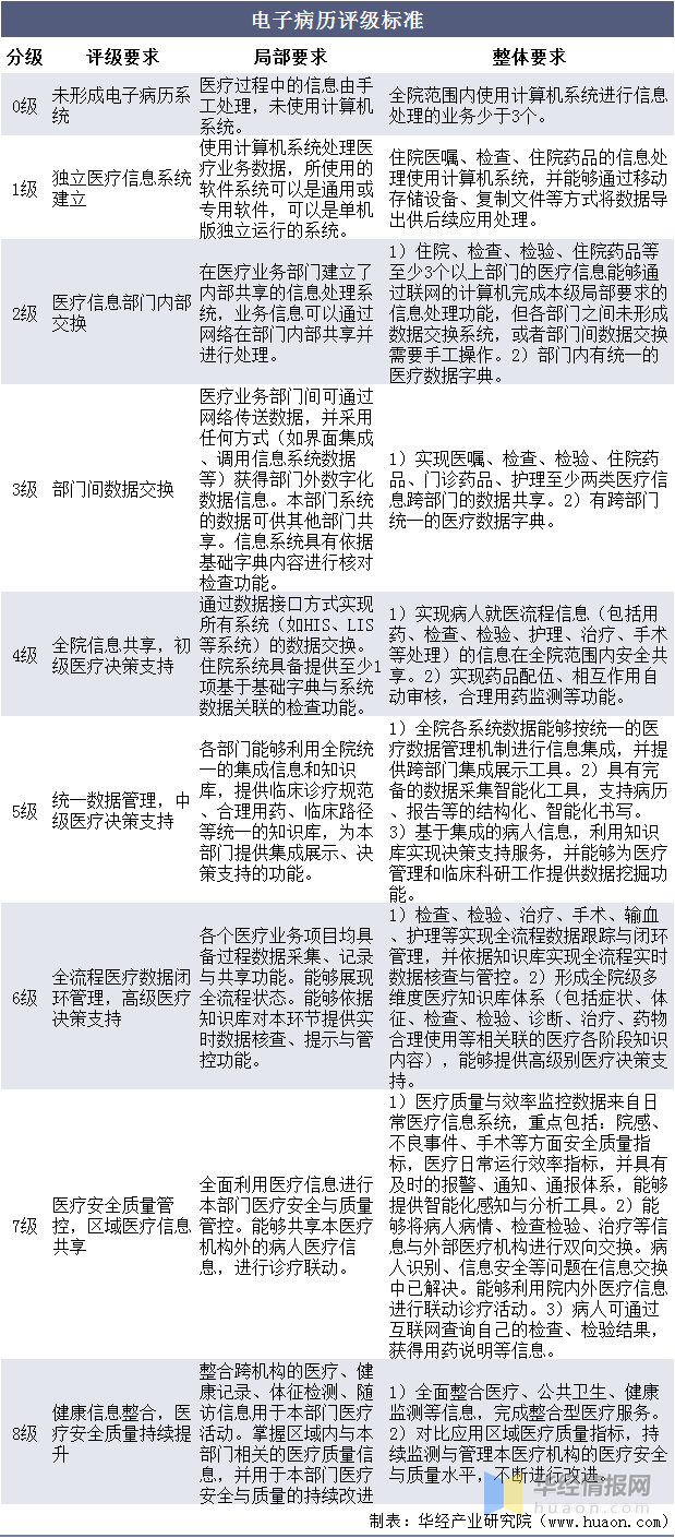 电子病历是利用计算机技术以及互联网技术,实现病人病历的电子化管理。2018年12月7日,国家卫生健康委员会印发了《电子病历系统应用水平分级评价管理办法(试行)》和《电子病历系统应用水平分级评价标准(试行)》,将电子病历系统应用水平划分为9个等级: