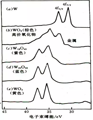 在XPS谱图上表现为谱峰相对于其纯元素峰的位移。增加价电子,使屏蔽效应增强,降低电子的束缚能;反之,价电子减少,有效正电荷增加,电子束缚能增加。W的氧化数增加,更多价电子转移到O离子,4f电子的束缚能移向较高能量。不同氧化态W相对与纯W的谱峰位移