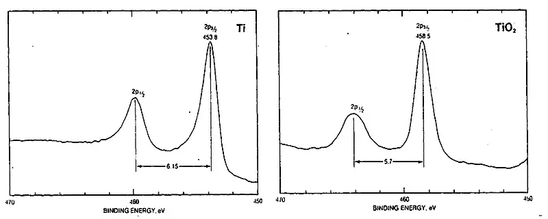 仪器材料的功函数Φ是一个定值,约为 4 eV,入射X光子能量已知,这样,如果测出电子的动能Ek,便可得到固体样品电子的结合能。各种原子,分子的轨道电子结合能是一定的。因此,通过对样品产生的光子能量的测定,就可以了解样品中元素的组成。元素所处的化学环境不同,其结合能会有微小的差别,这种由化学环境不同引起的结合能的微小差别叫化学位移,由化学位移的大小可以确定元素所处的状态。例如某元素失去电子成为离子后,其结合能会增加,如果得到电子成为负离子,则结合能会降低。因此,利用化学位移值可以分析元素的化合价和存在形式。