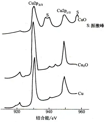 Cu、 CuO和Cu2O的结合能差距不大,鉴别困难。Cu和Cu2O没有2p3/2谱线的振激峰;而CuO则有。XPS谱图分析——能量损失线