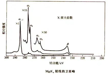 用来照射样品的单色x射线并非单色,常规Al/Mg Kα1,2 射线里混杂能量略高的Kα3,4,5,6 和Kβ射线,它们分别是阳极材料原子中的L2和L3能级上的6个状态不同的电子和M 能级的电子跃迁到K 层上产生的荧光X射线效应。这些射线统称XPS卫星线,所以导致XPS中,除Kα1,2所激发的主谱外,还有一些小的伴峰。