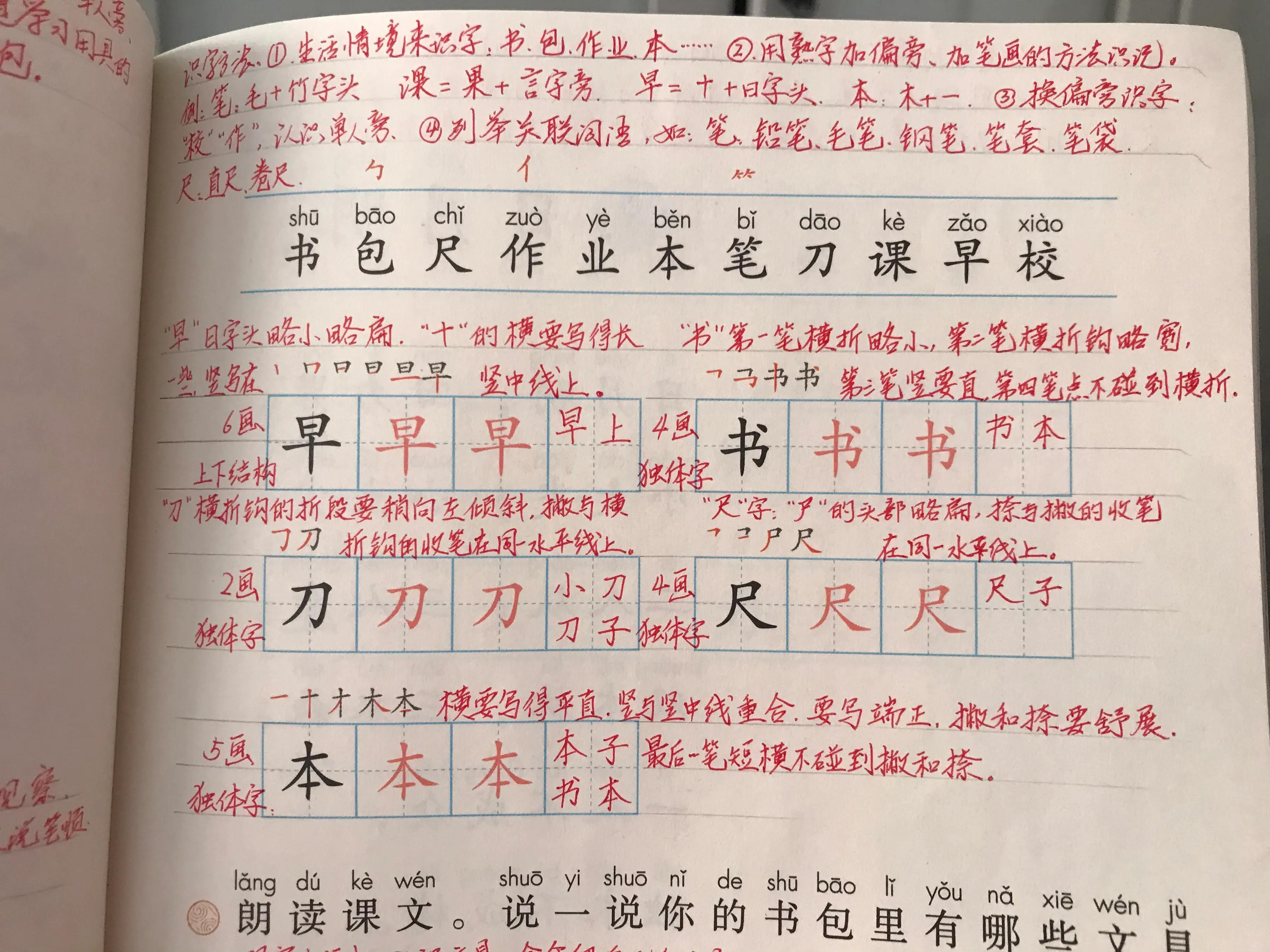 1.通过图文对照、归类识字等方法,认识“书、包、尺、作、业、本、笔、刀、课、早、校”等11个生字和包字头、单人旁、竹字头三个偏旁。
