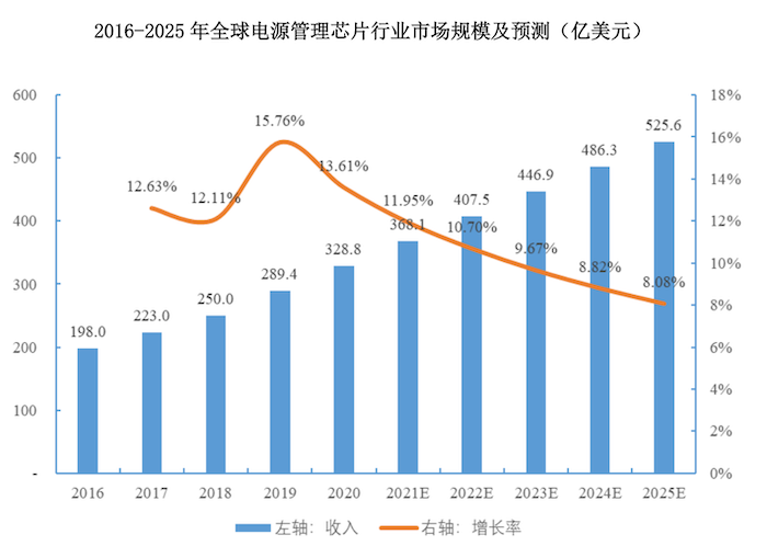 行业上,Frost&Sullivan数据显示,2016年至2025年全球电源管理芯片收入增速将不断下滑。中国电源管理芯片厂商目前的市场占有率仍然相对较低。2020 年, 中 国前十大本土电源管理芯片设计企业的市场份额合计仅为 7.51% 。