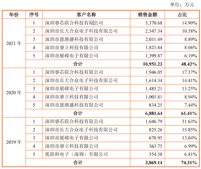 报告期,智融科技前五大客户也是经销商客户,来自前五大经销商客户销售收入合计占营业收入的比例分别为74.31%,61.41%和48.42%,集中度较高。值得注意的是,智融科技前五大经销商 客户 均系深圳市的公司。