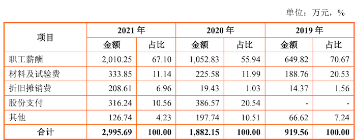 招股书显示,2020年,智融科技材料及试验费占研发费用的比例从2019年的20.53%降低至2020年的11.99%,并进一步降低至2021年的11.14%。