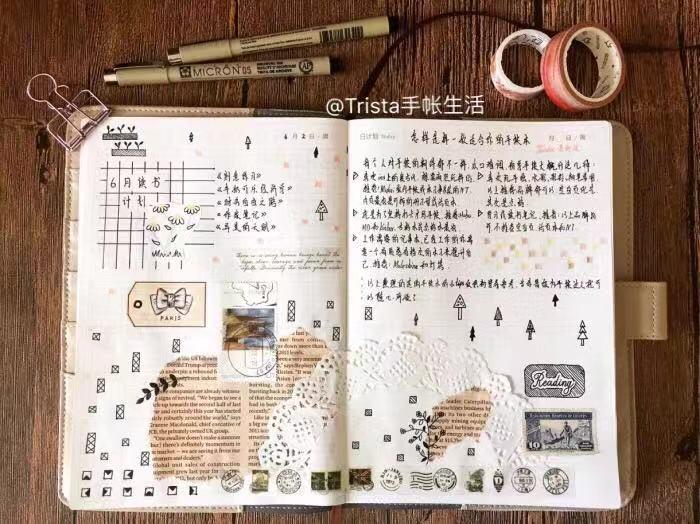 硫酸纸纸质纯净,半透明,不易变形,而且耐晒、耐高温,印上图案总给人一种朦胧感,花样以森系和复古风格最多,十分适合做拼贴复古类手帐。建议选购自粘型带图案的贴纸,虽然价格稍微有点高,但用起来方便,不粘的贴纸偏硬,不太容易粘贴。