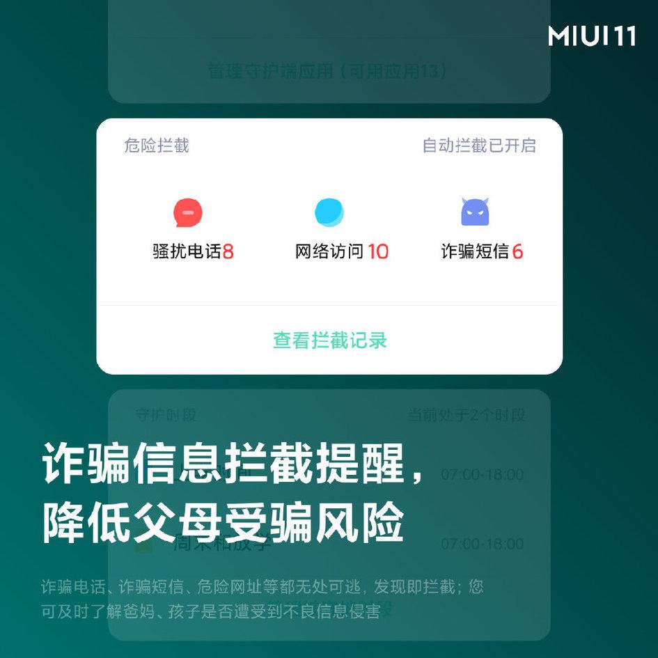 另外,当家人收到骚扰电话、诈骗短信或访问危险网址时,MIUI11 将会进行拦截,拦截记录会显示在你的手机上。