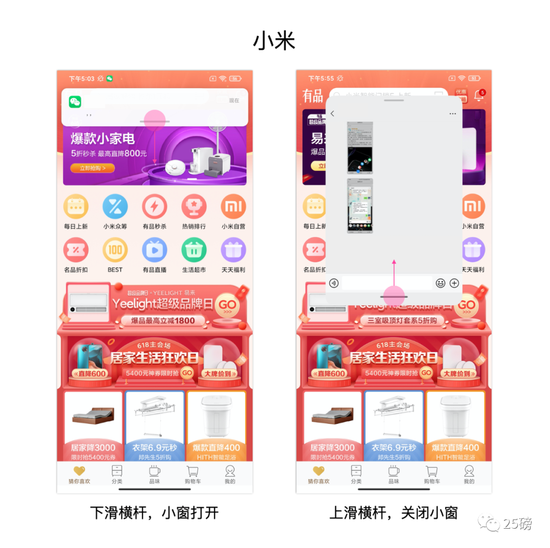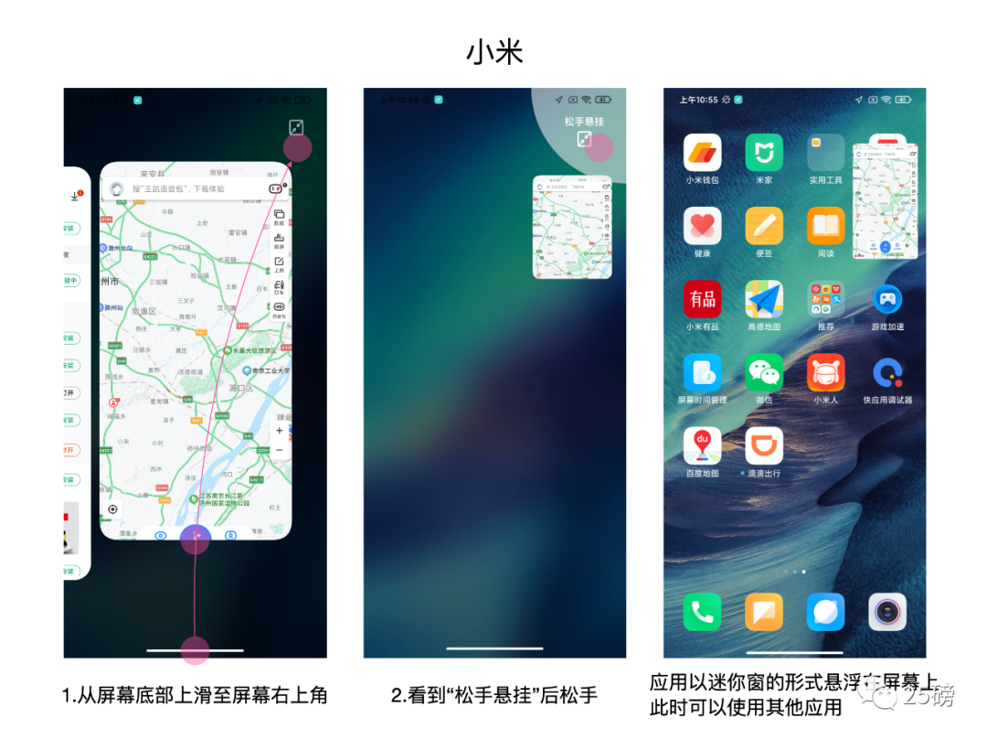 小米则不能在不离开应用 A 的情况下主动打开应用 B,需要先进入最近打开的应用界面,再点击“小窗应用”按钮展开“小窗应用”窗口。这个交互可以进一步优化,当“小窗应用”窗口里有应用时,默认展开“小窗应用”窗口,从而减少一步操作。