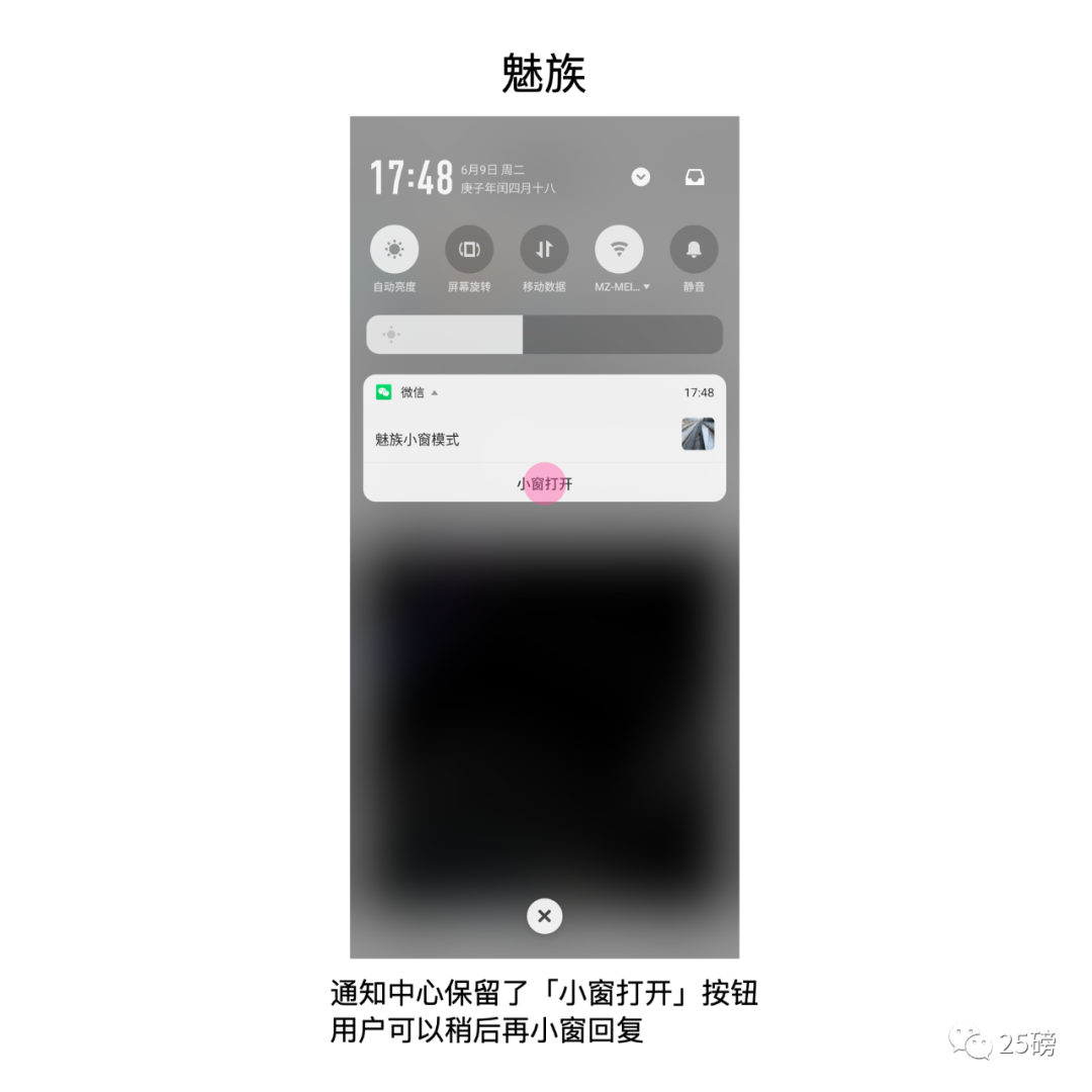 如果看小说时来了消息,想看完这个段落再回消息,虽然通知已经消失了,但还在通知中心里,魅族的通知中心里依然保留了「小窗打开」按钮。