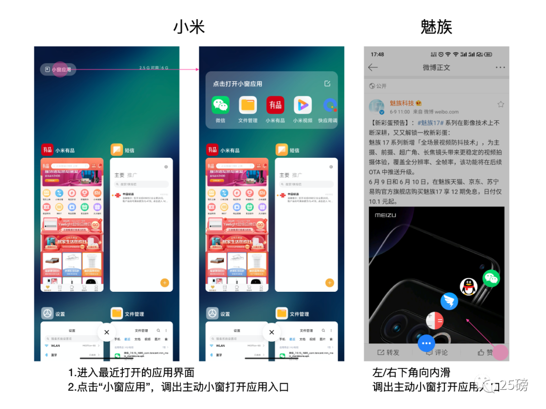 屏幕上明确的标识,比如应用的图标;机身按键,比如 iPhone 双击侧键打开Apple Pay;在屏幕上作出特定动作,比如从屏幕底部上滑回到桌面;语音识别。魅族的方案是从屏幕左/右下角向内滑,调出主动小窗打开应用入口,手指停在哪个图标上再松开,就直接小窗打开那个应用。