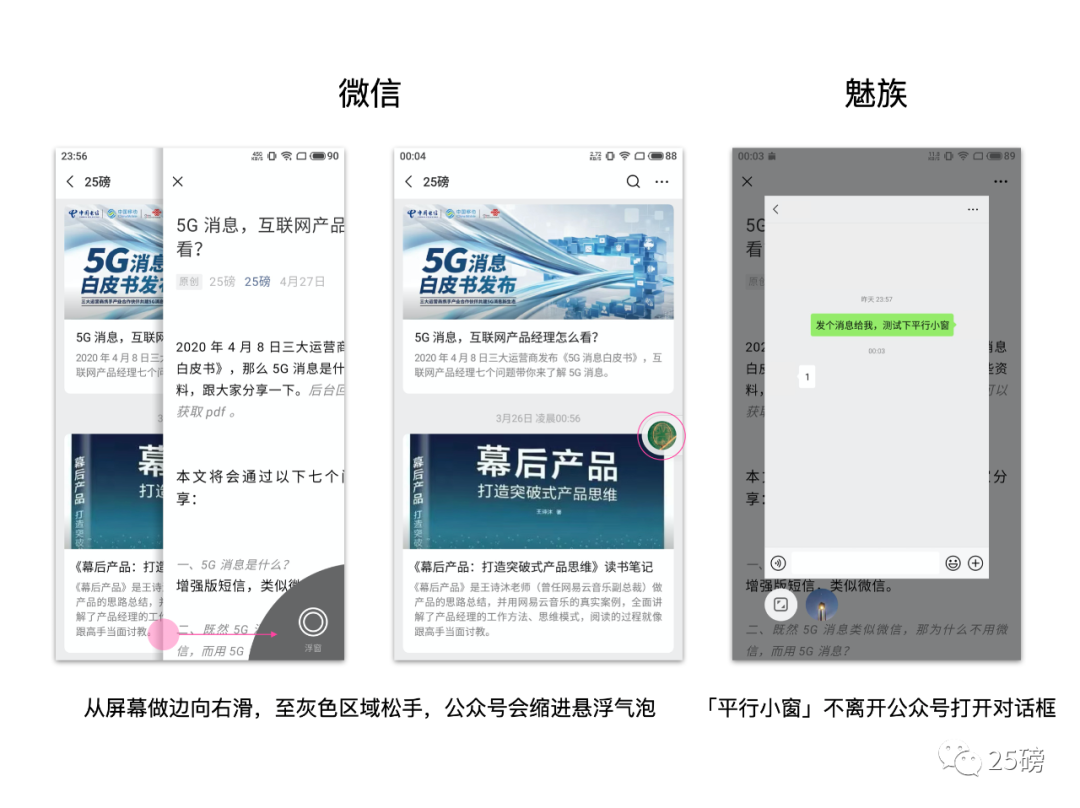 魅族的小窗此时则更加巧妙:在微信公众号里小窗打开微信对话。相当于同时打开了同一账号的两个微信,这个交互魅族称为「平行小窗」。