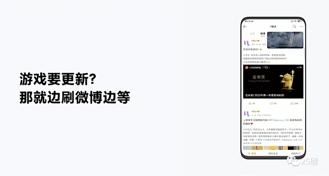 MIUI 12 发布会上介绍了这个场景:等待游戏更新时将游戏缩小为「迷你窗」悬浮在屏幕上,此时可以刷微博,而不必等着游戏更新完而什么都不能做。