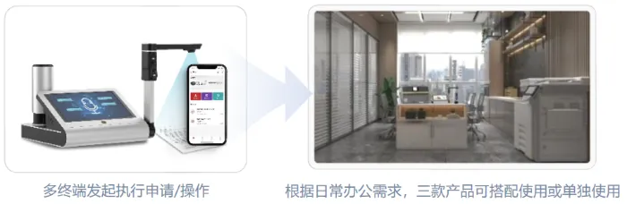 集团总部与分子公司日常办公固定区域用印,或建立并管理日常办公用印数据库时,可通过OA/App发起用印申请审批流,连接驱动多场景智能硬件终端,满足用印需求并管理用印记录。