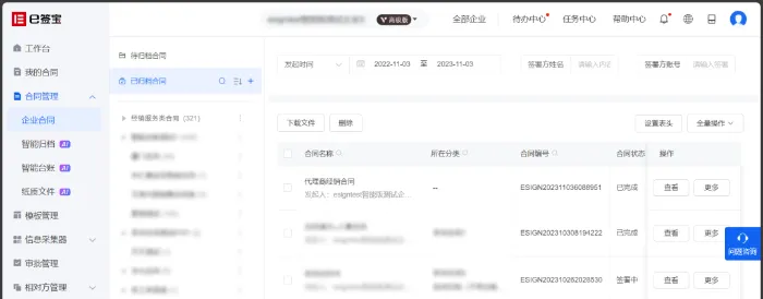 e签宝帮助企业统一管理印章、文件、签署证据。内部合同与证明文件可批量发起、签署,各区域几千份合同也只需要3分钟处理。
