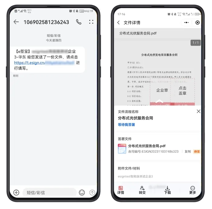引入e签宝电子合同服务,合同生成、审核、认证、签署、归档、调阅全流程在线完成,农户打开手机短信即可签署安装服务合同。如有纸质合同也可上传系统,进行智能比对,防范合约风险。