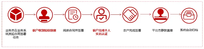 业务员在农户家中,通过业务平台软件发起签署任务,农户手机收到短信签署链接,完成个人实名后签署合同,平台盖项目公司印章。