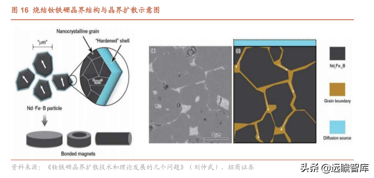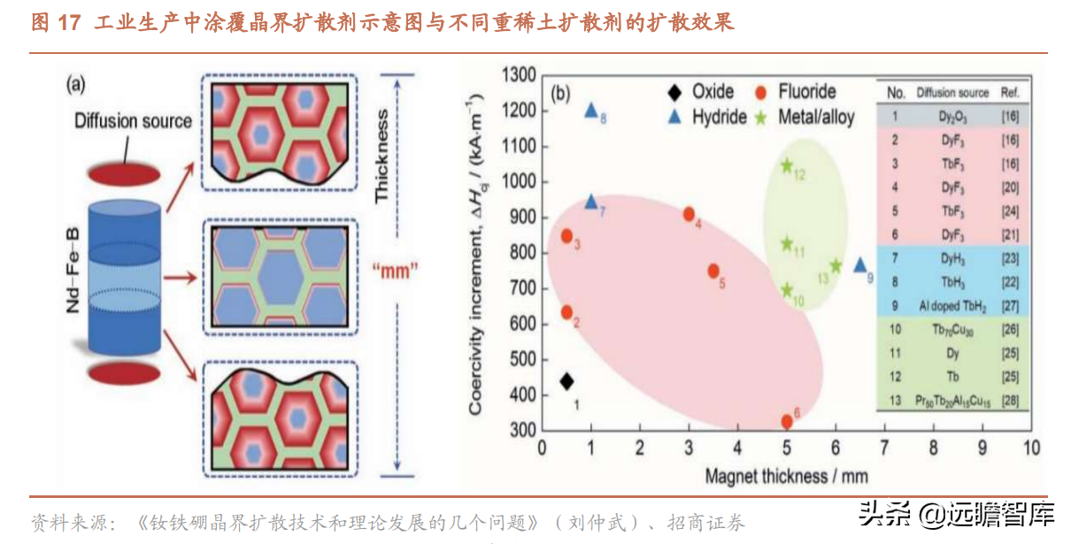 为了扩大市场占有率,磁材企业竞相通过晶粒细化、晶界扩散等途径降低镝、铽等中重稀土用量,甚至发展超轻稀土永磁,以降低磁材成本。其中,晶界扩散技术是 21 世纪钕铁硼甚至整个永磁行业的一个重大技术革新。