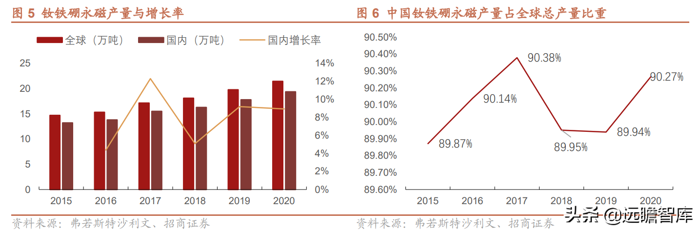 据弗若斯特沙利文数据,2020年全球稀土永磁材料产量约 21.74 万吨,2015年约为14.99万吨,复合增速为7.7%。其中中国产量由2015年的13.47万吨提升至2020年的19.62 万吨,占比由 89.86%升至90.25%,年均复合增长率达到6.58%。