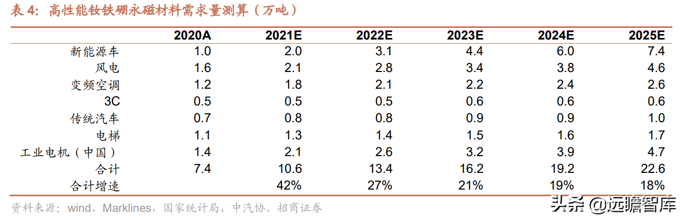 根据我们测算,几个重要下游消费将带动高性能钕铁硼永磁材料全球总需求量从2020年的 7.4 万吨提升到2025年 22.6 万吨,年复合增速 25%。