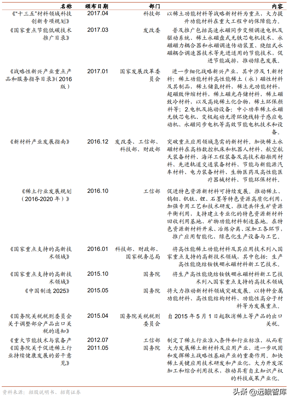 近年来,党和国家基于“五位一体”总体布局和“四个全面”战略布局,坚持创新、协调、绿色等发展理念,积极推进创新驱动型战略和可持续发展战略,依照需求牵引和战略导向,陆续出台了一系列指导、促进稀土永磁等新材料产业良性发展的法律法规和政策,推动“一代装备,一代材料”向“一代材料,一代装备”转变,对包括公司在内的一批稀土永磁材料企业产生了较为积极的影响,包括: