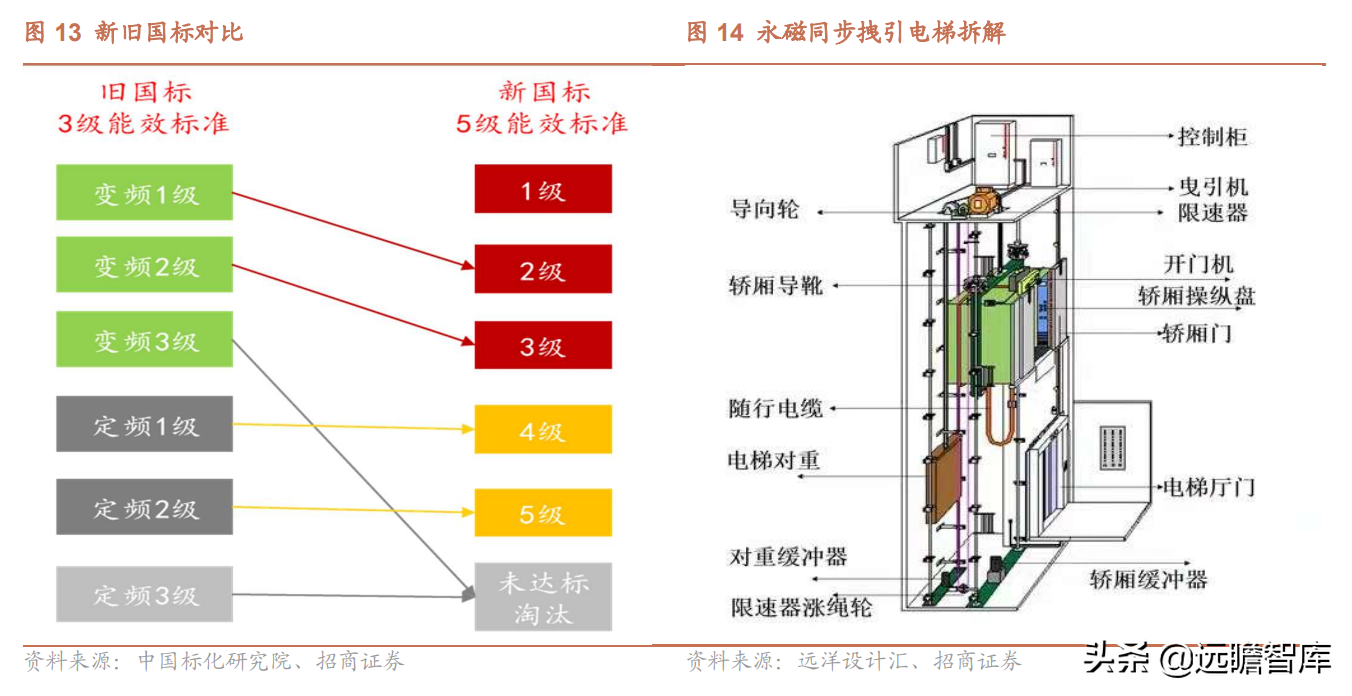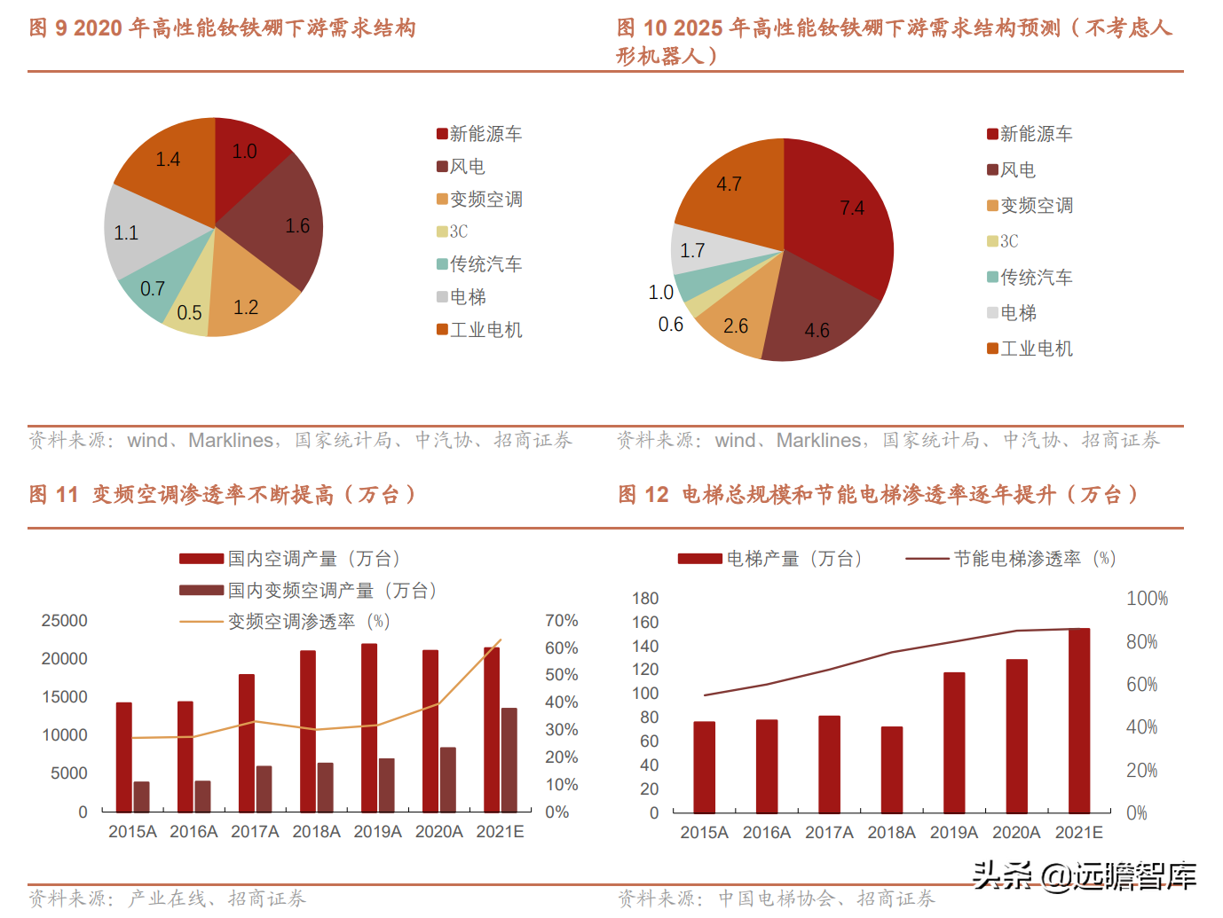 2020年 7 月 1 日开始实施《房间空气调节器能效限定值及能效等级》(GB 21455-2019)将变频与定频能效标准合并,原三级定频及部分能效较差的三级变频和定频空调停止生产,据中国标准化研究院测算,能效新国标的实施将使目前空调市场淘汰率达到 45%,预计符合一级、二级能效标准的变频空调(高端变频空调)只能采用高性能钕铁硼永磁体,钕铁硼永磁变频压缩机渗透率将实现跨越式增长。