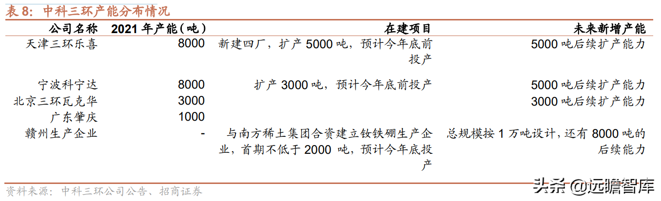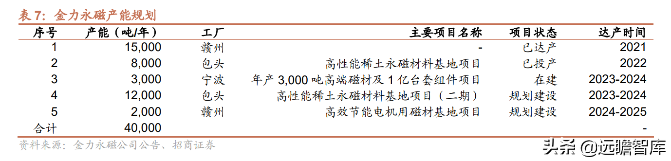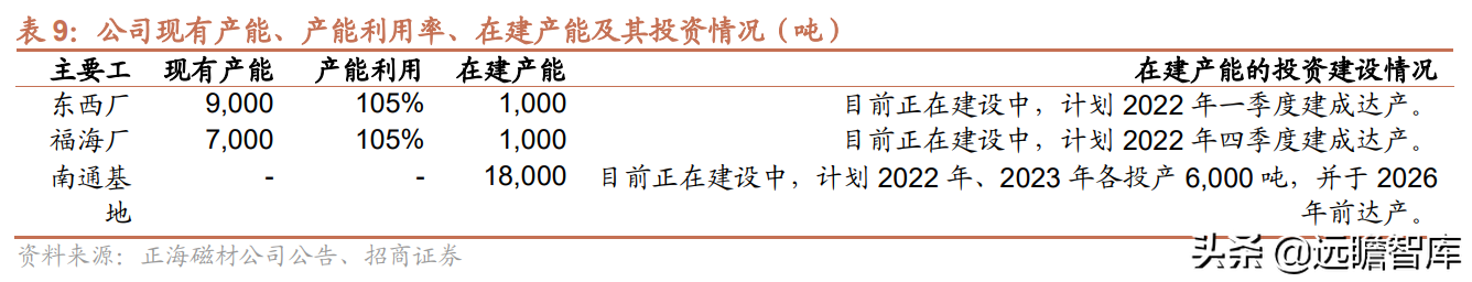 目前产能达5000吨,包头基地年产8000吨高端制造高性能稀土永磁材料及器件项目预计 2022年年初开工,2023年投产(8000吨产能),分两期建成(每期4000吨),全部达产之后预计稀土永磁实际加工能力达 1.3 万吨以上。