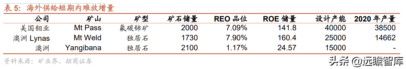 澳大利亚 Mount Weld 设计产能 2.5 万吨/年,2021财年年产量约 1.9 万吨,短期内提供增量的可能性不大。澳洲 Hastings 在建项目 Yangibana 项目原计划2023年投产,但是尚未完成债务融资。