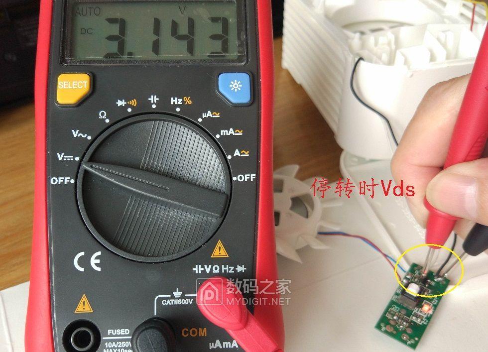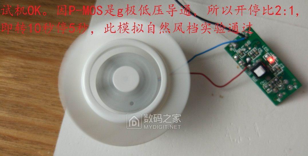 拆机过程观察,转停比不合适。电路板原来控制电机的模式是1:4,即约转5秒,停20秒循环,转时偏短,停时太长,不能直接用于模拟人体舒适的阵风。当然,就算能直接用,志高USB台扇工作电流是原配风扇是数十倍,风扇的开关管J3Y也得换成大电流的,场管自然最合适了。