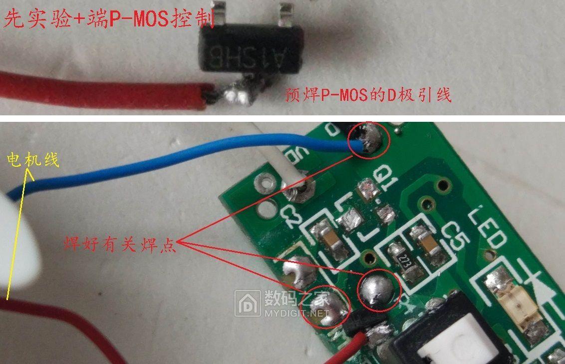 上图已特别注明连续风的实现方法,需要2个开关配合,后面不再赘述。下面就是逐个验证想法是否可行。先试试准备添加的电机+端开关管控制,板上临时贴高温胶带绝缘无焊盘的D极