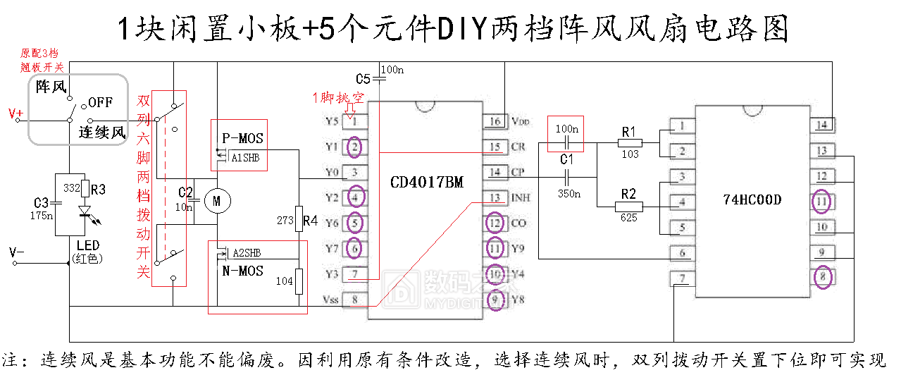 开停比解决,脑子里规划了一下整体的改造方案,如下图(此图后画,当时是边弄边想)。1. 计数器7脚(Y3)连上15脚,改开停比为1:2。2. 用A2SHB替换J3Y,适应志高台扇工作电流需要。3. 电机+端增加A1SHB开关管,仍采用3脚信号驱动,它工作时,将原来的开停比1:2,颠倒成2:1,多一种阵风模式选择。4. 主开关为连续风、关、阵风3档。阵风下,通过拨动开关切换,短路电机+或-端的开关管,实现开停比1:2或2;1的阵风模式选择。5. 因实验时电源是3V干电池,未来应用是USB取电5V,应该会影响时间常数,不会算,直接C4位加1个100n贴片电容做点补偿。