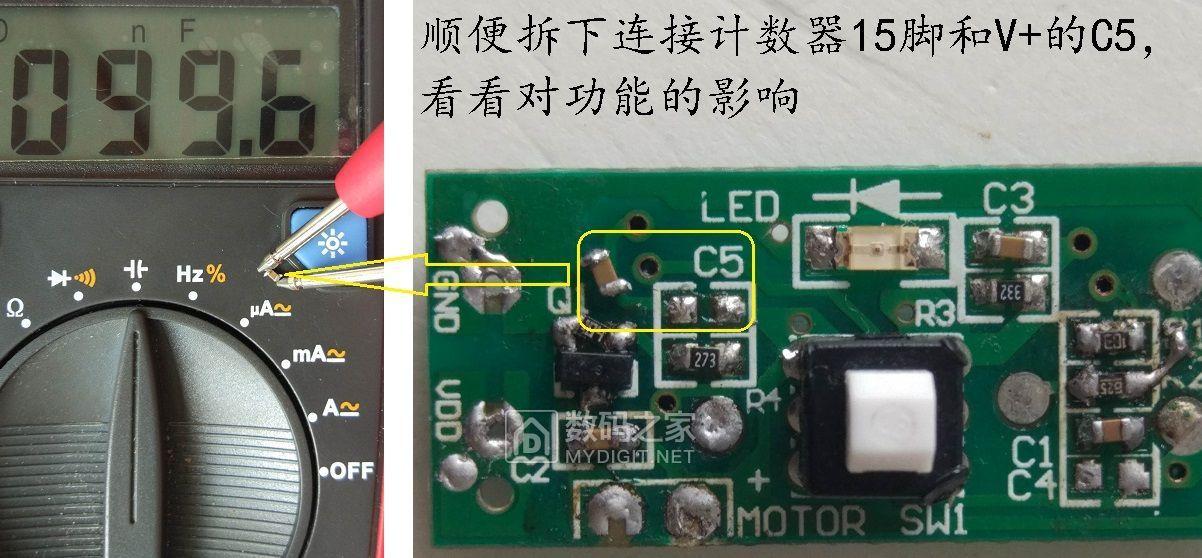 小插曲:过程中顺便拆下15脚连接电源+的C5,看看有什么影响,从而判断用途