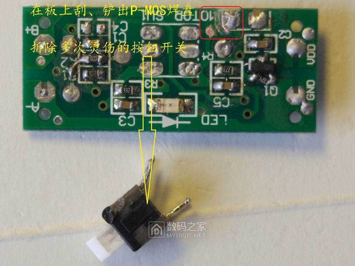 最初的想法逐一通过了,开始正式改。拆除按钮开关,割、刮出给A1SHB安家的焊盘。