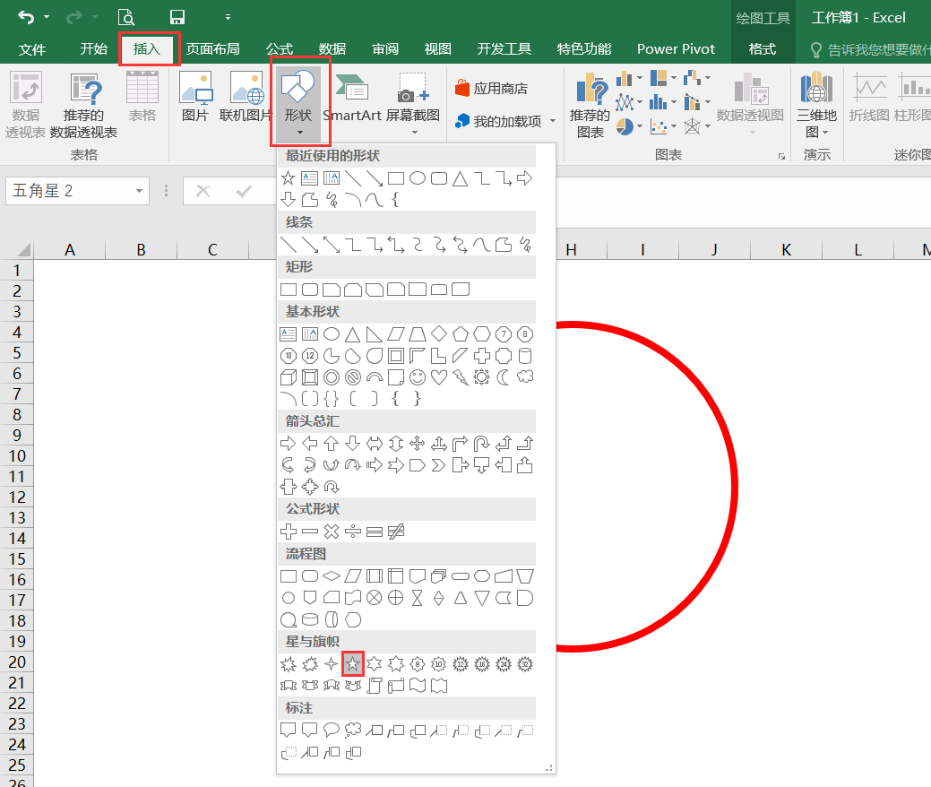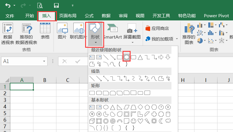 首先,在Excel中插入一个形状,选择一种圆型,如下所示: