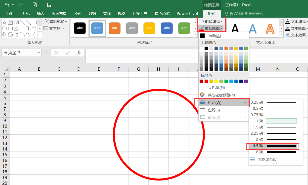按住SHIFT键,然后画一个正圆型,然后在格式选项里面调整形状填充为无,调整形状轮廓为红色,粗细里面选择粗一点的,4.5磅大小,如下所示: