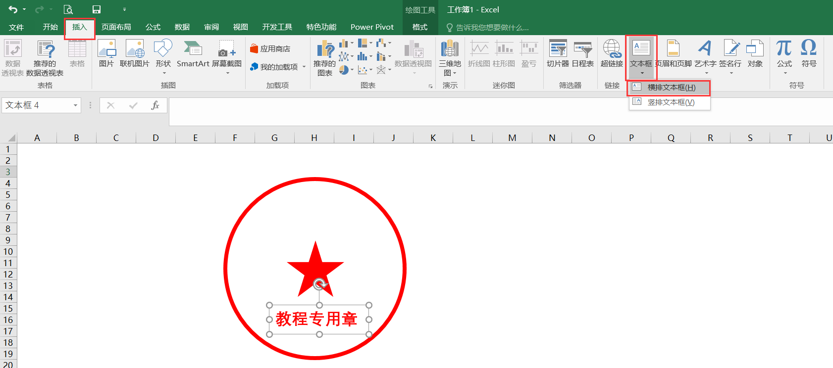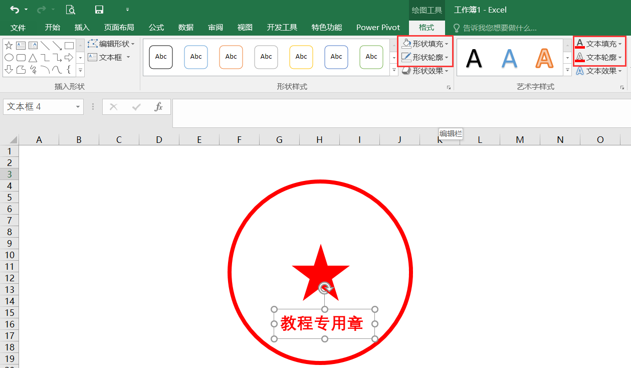 然后插入一个文本框,输入教程专用章,将文本框的形状填充和轮廓填充都设置为空白,将字体设置为红色,如下所示: