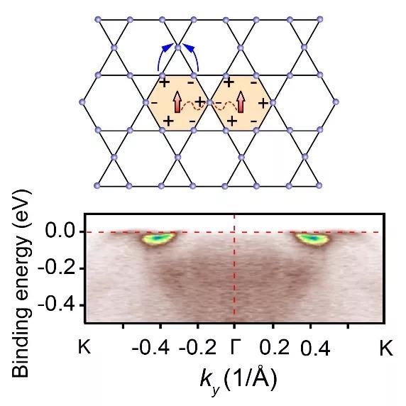 kagome晶格上电子态相消干涉导致局域化和自旋耦合导致铁磁性的示意图(上图);角分辨光电子能谱实验观测下的平带(下图)